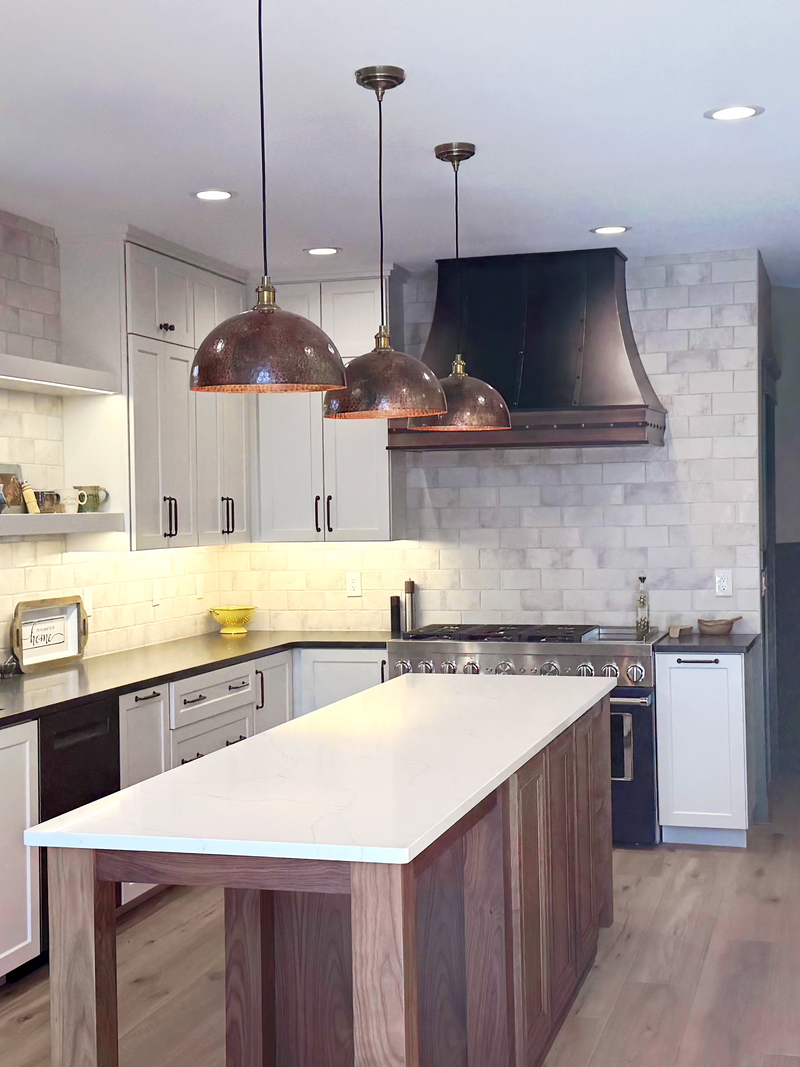 View full detailsThis beautiful handmade curved copper vent hood, with a hammered apron, adds a stunning touch to any rustic kitchen. The classic Farmhouse Custom C...