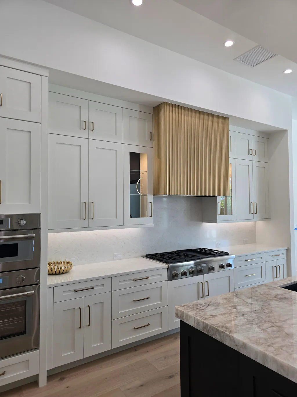 Elevate your kitchen with the RangeHoodMaster Luxury Custom Brass Box Range Hood. Its unique rib design in brass good accents adds a touch of luxury to your space. No straps or rivets for a seamless look, while the gold accent adds a touch of elegance. Transform your kitchen with this stunning box range hood.
