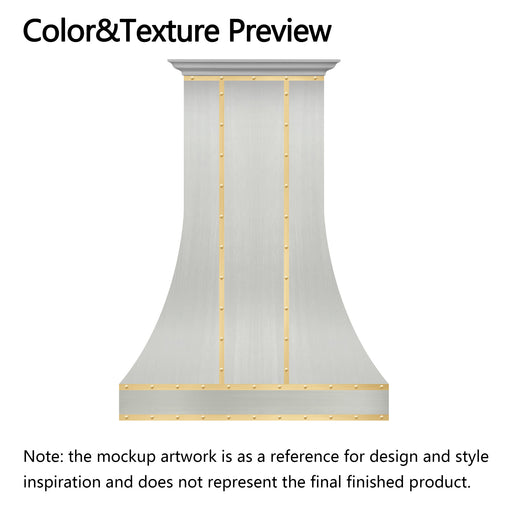 Sloped Handcrafted Stainless Steel Custom Vent Hoods SH11-4TRLBody: Brushed Stainless steelStraps: Brushed BrassRivets: Brushed Brass (small rivets...