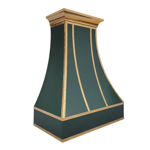 View full detailsThis custom stainless steel range hood features a sophisticated light green painted finish, complemented by brass decor for a French-inspired look....