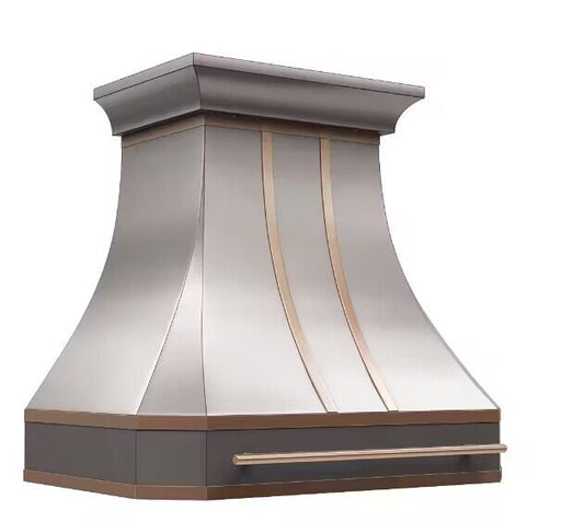View full detailsSH3 series custom stainless steel range hood40''w x 33''h x 21''d, wall mountedBody: brushed stainless steelStraps: Penny copper patinaPot rail: Pe...
