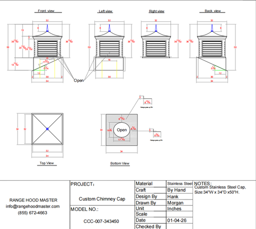 Custom Stainless Steel Chimney Cap CCC-007 16 gauge body finish: Standard Color Finish 34" Width x 34"Length x 50''Height, top mounted Standard f...