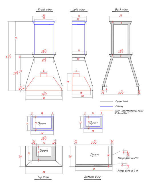 View full detailsRHM Custom Copper Kitchen HoodBody finish: standard regular finish21"D, wall mounted36'' Width x 30'' Height36" Liner+390 CFM Internal Motor (7" ro...