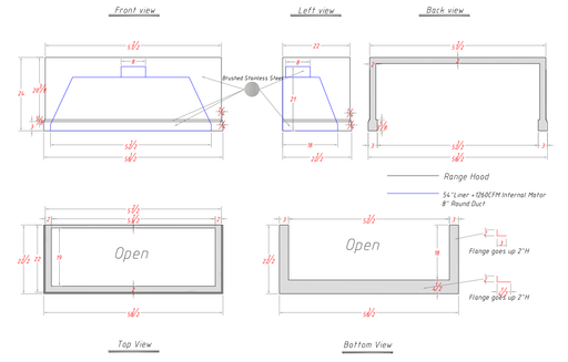View full detailsRHM Custom Stainless Steel Range Hoodbody finish: brushed stainless steel22-1/2"D, wall mounted58-1/2'' Width x 24'' Height54" Liner+1260 CFM Inter...
