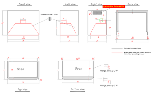 View full detailsCT-VH07TR4Body: standard regular finishApron Pattern: None36''W x 50''H x 21"D wall mount36" Liner + 610CFM Internal Motor (6" round duct)