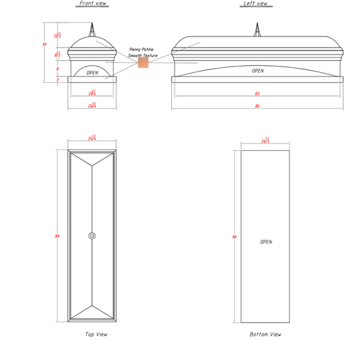 View full detailsRHM Custom Copper Chimney CapBody Finish: penny patina, smoothThickness: 16 gauge24-1/4"Width × 86"Length × 30"HeightStandard free shipment (about ...