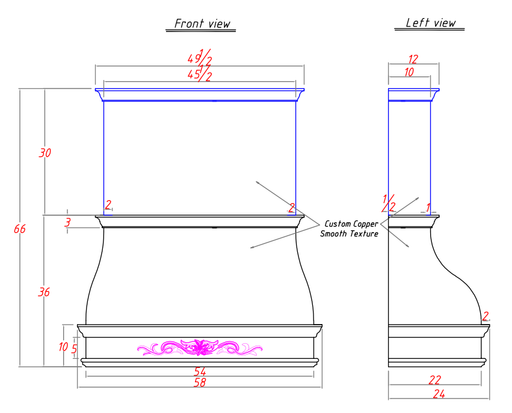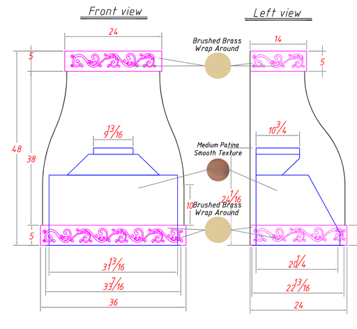 View full detailsRHM Custom Copper Range Hood Basic PriceBody Finish: dark patina smooth21"D, wall mounted36'' Width x 36'' Height36" Liner+390 CFM Internal Motor (...