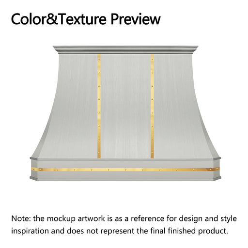 View full detailsSH33-3T-2 custom metal range hoodSize: 42"W × 39"H x 24''D, wall mounted body finish: Matte White Painted Stainless Steelstraps: Brushed Brass Ven...