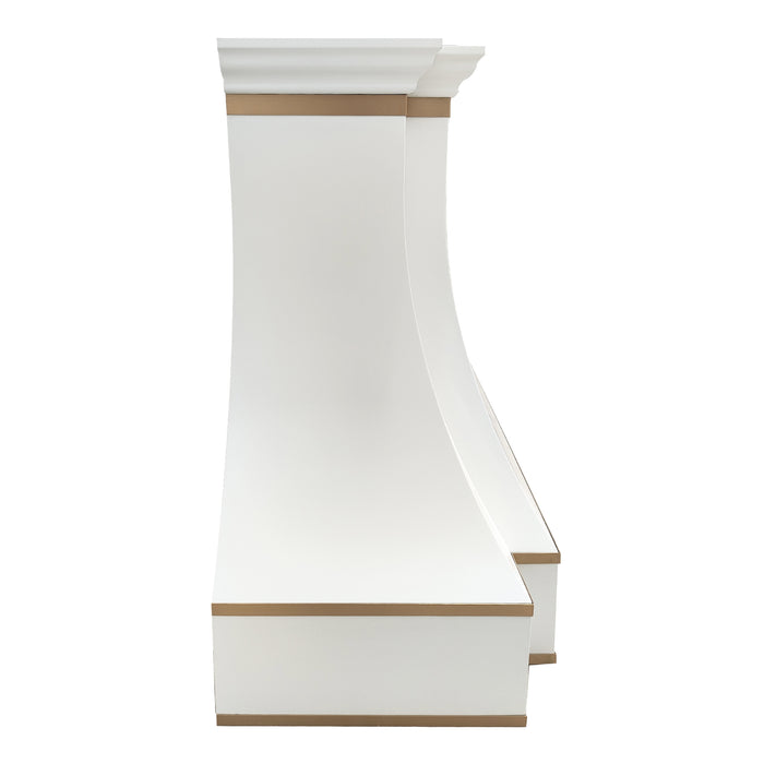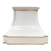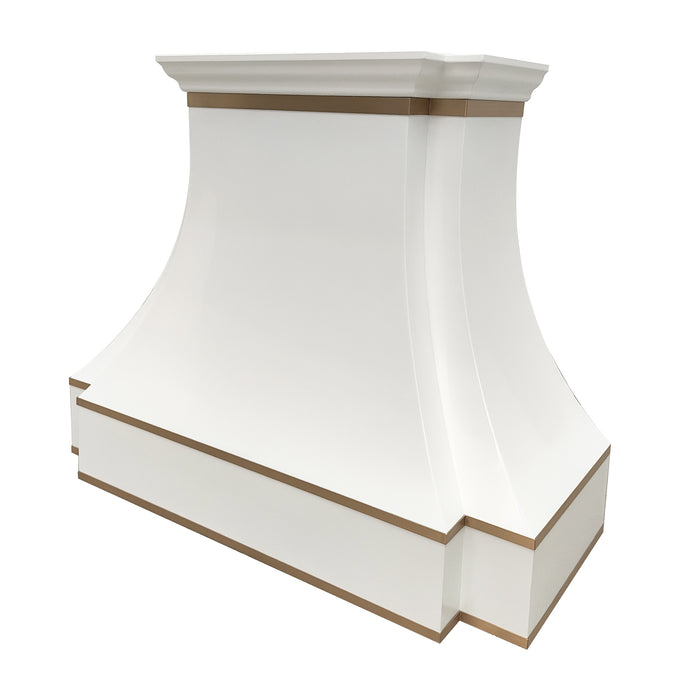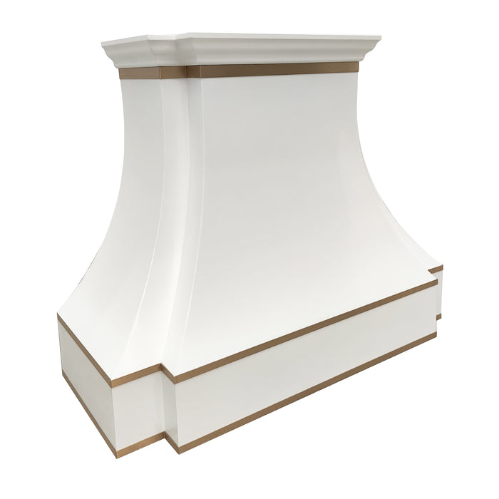 RHM designer customized stainless steel range hood SH33-C4BTR, features elegant white painted stainless steel body, with luxury brushed brass accessories and crown molding. Engineered for efficient ventilation, SH33 range hoods ensuring a smoke-free and odor-free cooking environment.