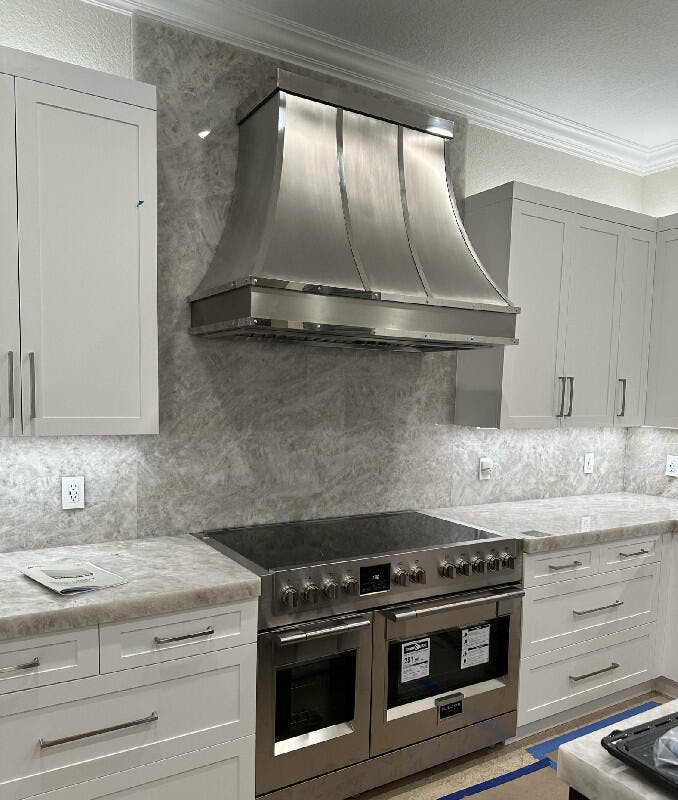 Add a radiant touch to your kitchen with this sweep brushed stainless steel custom range hood. With its mirror-like crown and polished bands, it is sure to captivate and inspire. Upgrade your cooking space today with this stunning, durable range hood!