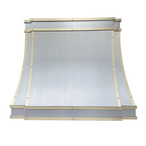 View full detailsRHM Stainless Steel Custom Range HoodBody finish: antique zincStraps & small rivets: brushed brass21"D, wall mounted48'' Width x 42'' Heighthoo...