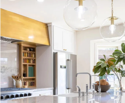 This kitchen feels so bright and welcoming now. The custom range hood fits the space perfectly, and the brass details add just the right amount of warmth.