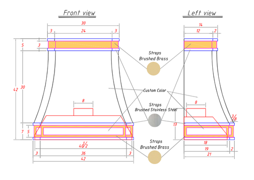 View full detailsRHM Custom Stainless Steel Range Hood SH33-R9BSsize: 36'' W x 21'' D x 38'' H, wall mountedBody Finish: Brushed BrassStraps: Brushed Stainless Stee...