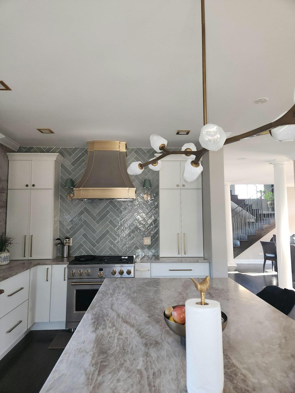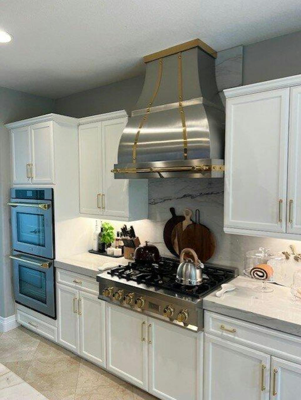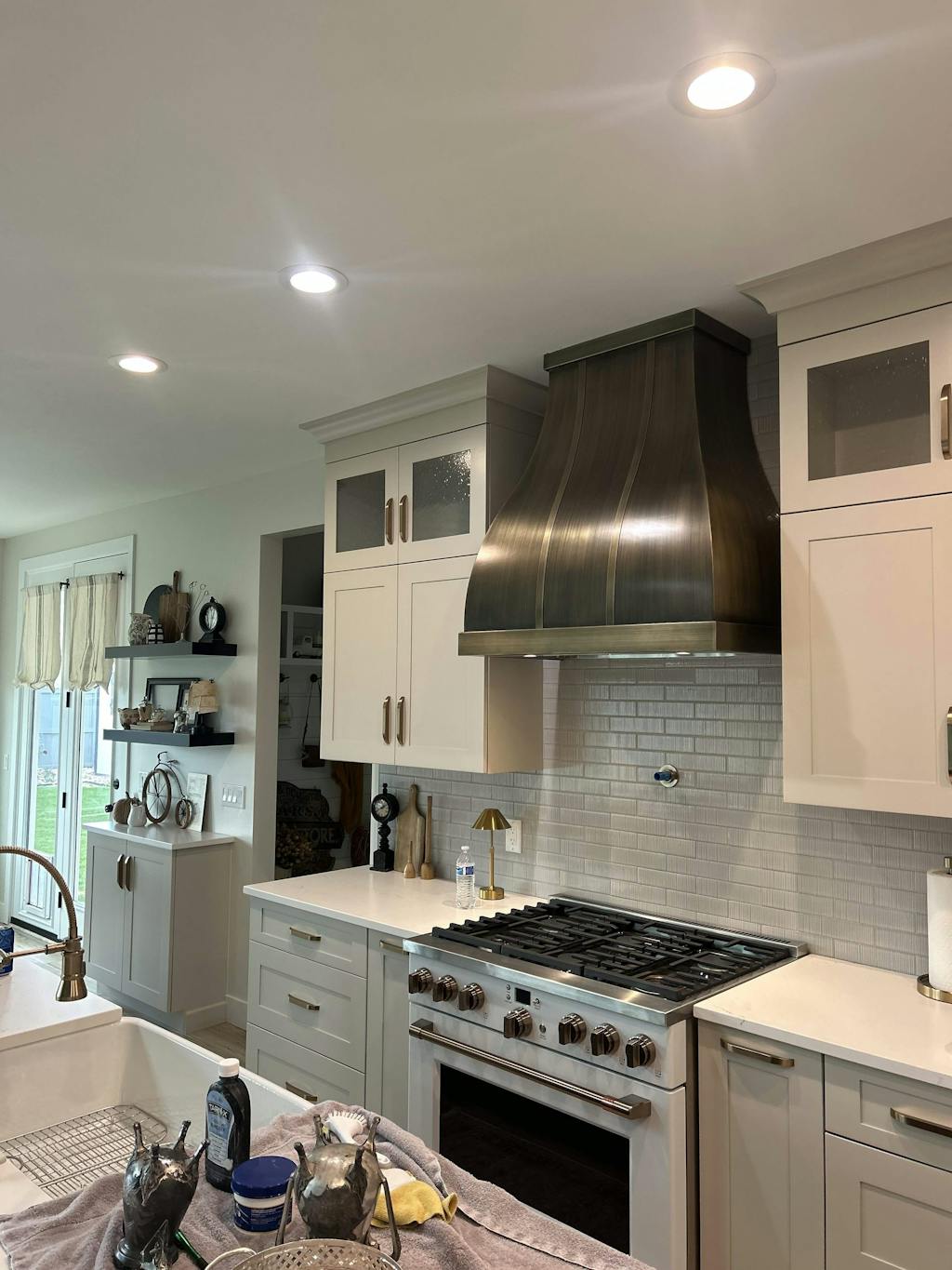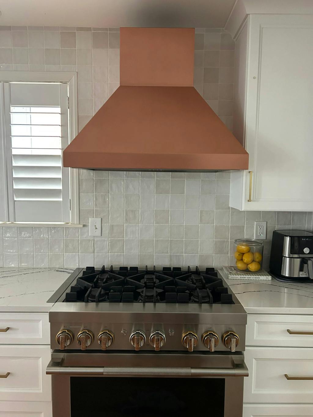 This kitchen feels so bright and welcoming now. The custom range hood fits the space perfectly, and the brass details add just the right amount of warmth.